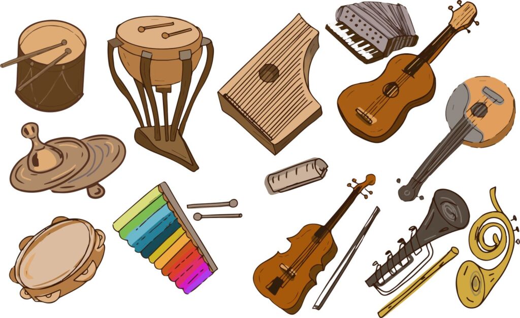 Los grandes grupos de instrumentos son los siguientes: flautas, bombos, tambores, silbatos, sonajeros, guitarras, acordeones y violines.