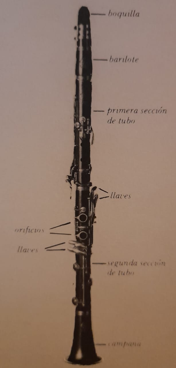 Se compone de la boquilla (segmento de tubo con una parte derecha provista de una abertura casi rectangular donde apoya la lengüeta, fijada por un anillo metálico que le ciñe a la base de la boquilla; ésta termina con una parte seccionada), del barrilete (pequeño segmento de tubo que une la boquilla con el cuerpo del instrumento; la longitud de esta sección determina el sonido básico del instrumento mismo, concepto que aclararemos más adelante), de dos secciones de tubo que llevan los orificios y las llaves (el pulgar izquierdo acciona en la parte posterior el portavoz, para emitir la duodécima del sonido fundamental, mientras el pulgar derecho apoya sobre una pletina colocada detrás de la sección inferior para sostener el instrumento) y de la campana o pabellón que concluye el tubo en su extremo inferior.